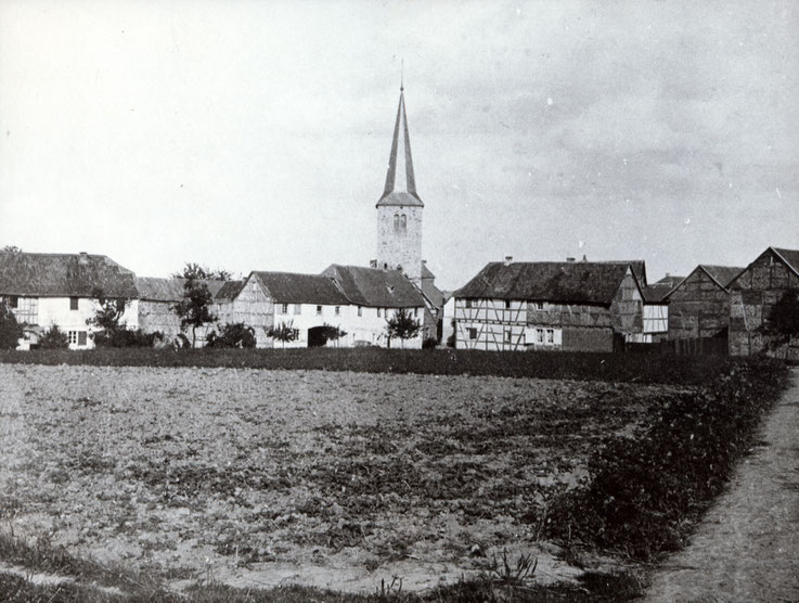 Um 1890 ist das Foto entstanden. Es zeigt einen Blick vom Zippenacker aus auf das Dorf. Die linke Häuserreihe bis zur Kirche steht an der Oevericher Straße. In dem Haus am linken Bildrand wohnte