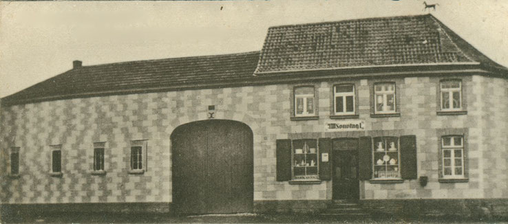 Das Bild zeigt das älteste Geschäft in Fritzdorf von Johann Wilbert Sonntag auf der Oevericher Straße. Das Gemischtwarengeschäft gab es seit 1855. Da das Gebäude keine Schaufenster hatte, wurden